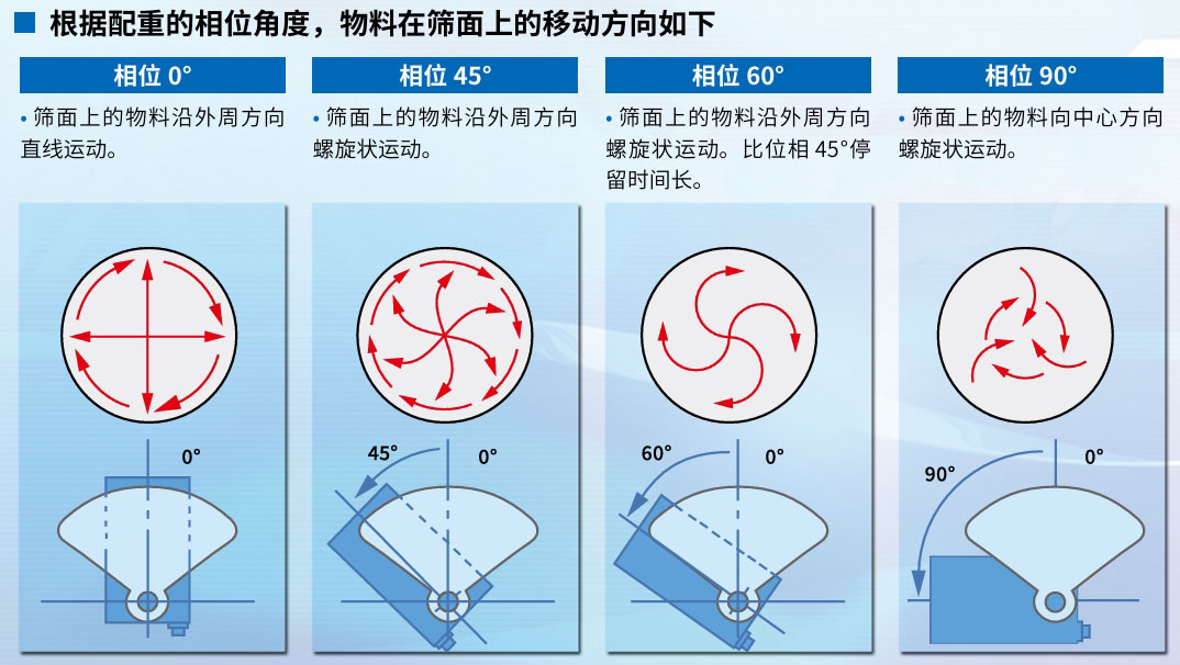 振動篩分機基本上是以篩面為中心進行振動的設備,其振動是由安裝在振動體兩端軸上的配重塊產(chǎn)生的。上部配重的旋轉會使篩面產(chǎn)生水平振動,起到將輸送至篩面中心的物料向旋轉方向移動的作用。下部配重的旋轉則會使篩面產(chǎn)生垂直振動,起到將物料向外周方向移動的作用。這些振動結合在一起,從而使篩面產(chǎn)生三維運動。通過改變下部配重相對于上部配重的相位,振動的性質會發(fā)生變化,能夠獲得適合待處理物料特性的運動。