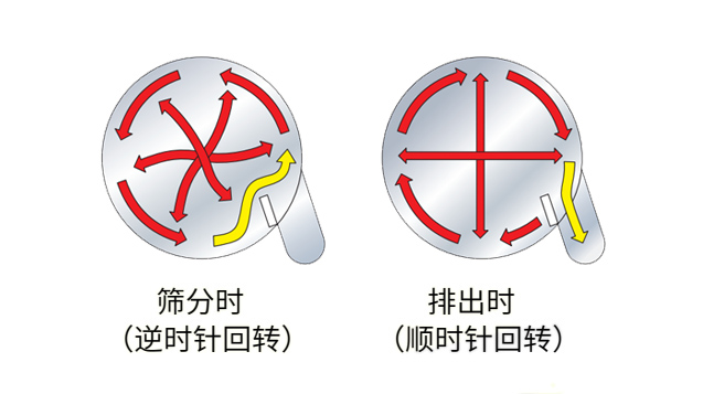 反轉功能,可使篩分階段(逆時針回轉)與排出階段(順時針回轉)的原料流向逆轉,通過反復運行,可實現(xiàn)最高效、接近 95% 以上的完美篩分與排出。